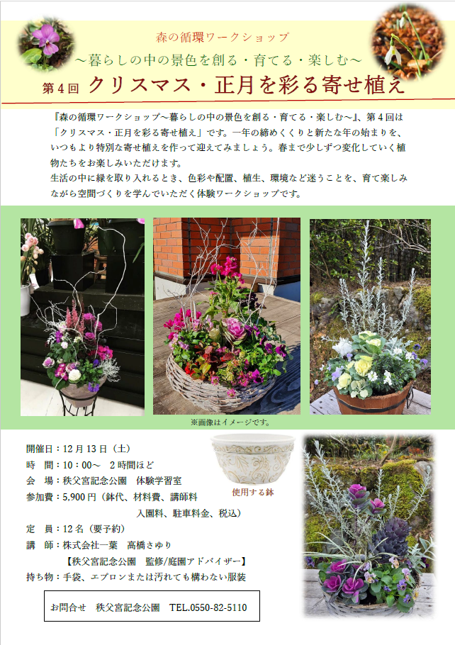 森の循環ワークショップ~暮らしの中の景色を創る・育てる・楽しむ~。第4回は『クリスマス・正月を彩る寄せ植え』です。