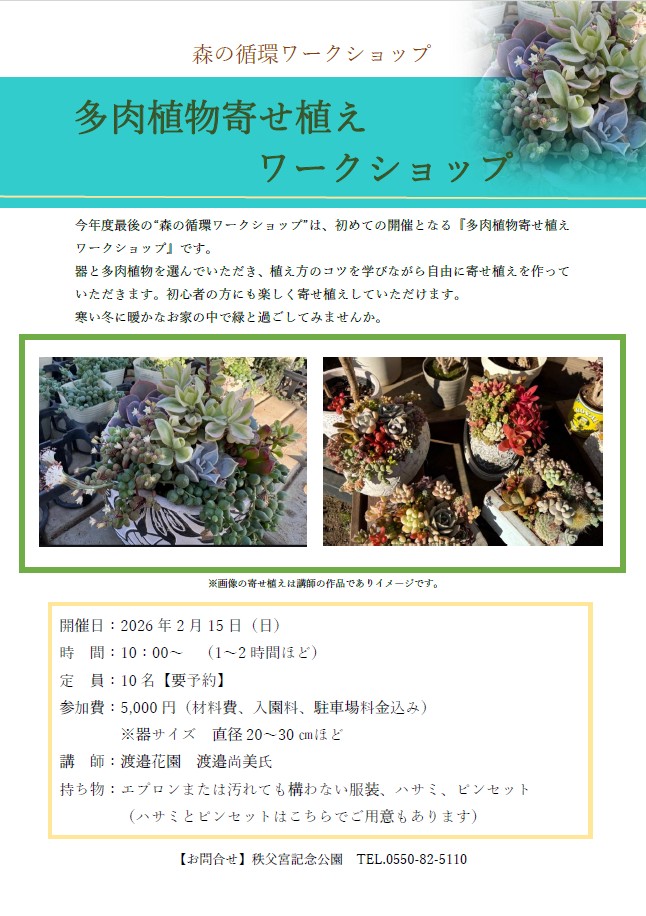 2月の【森の循環ワークショップ】は『多肉植物 寄せ植えワークショップ』です。