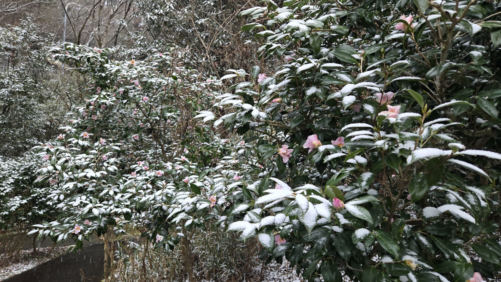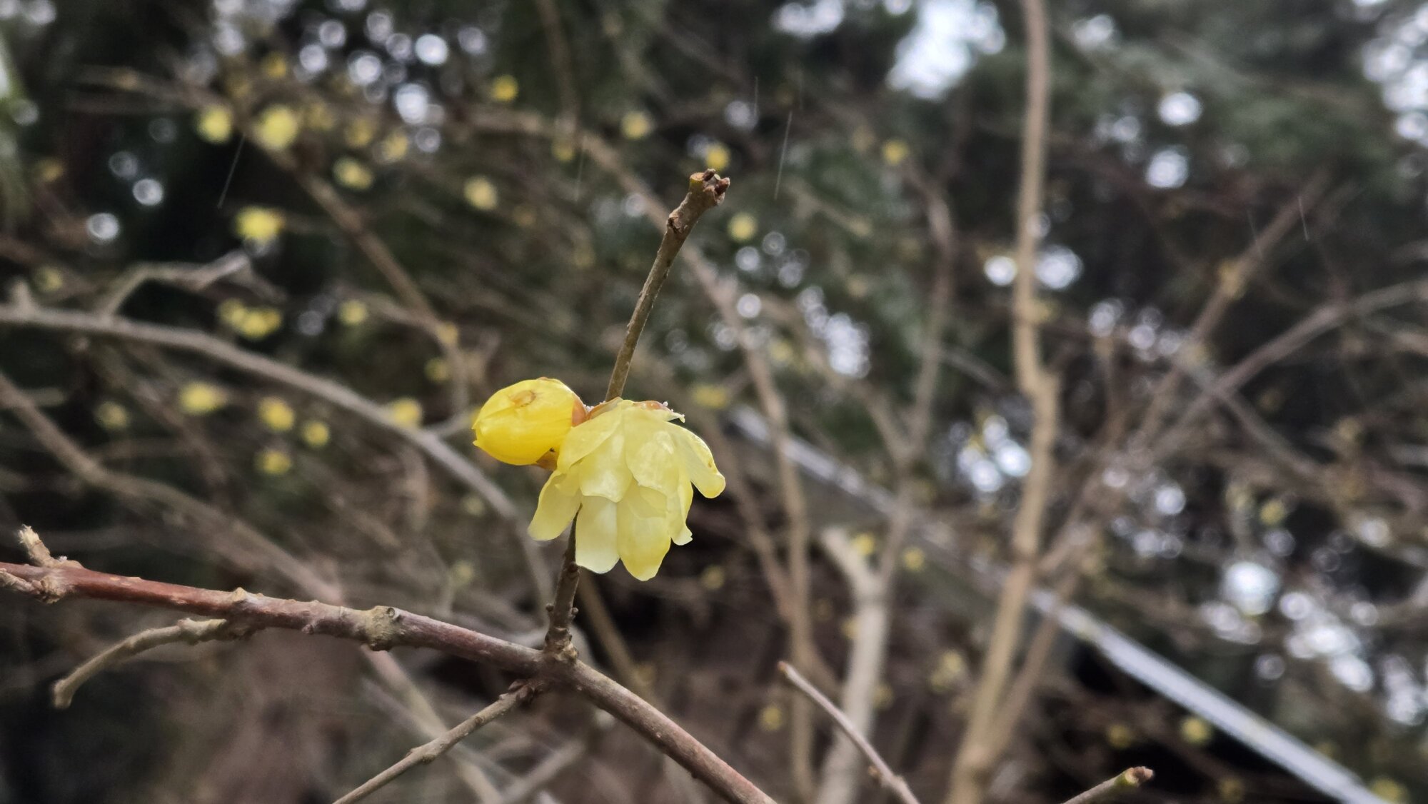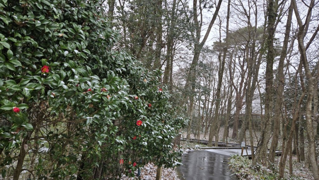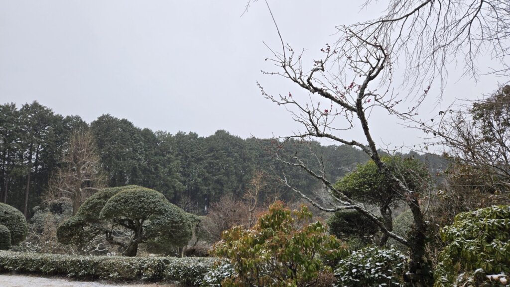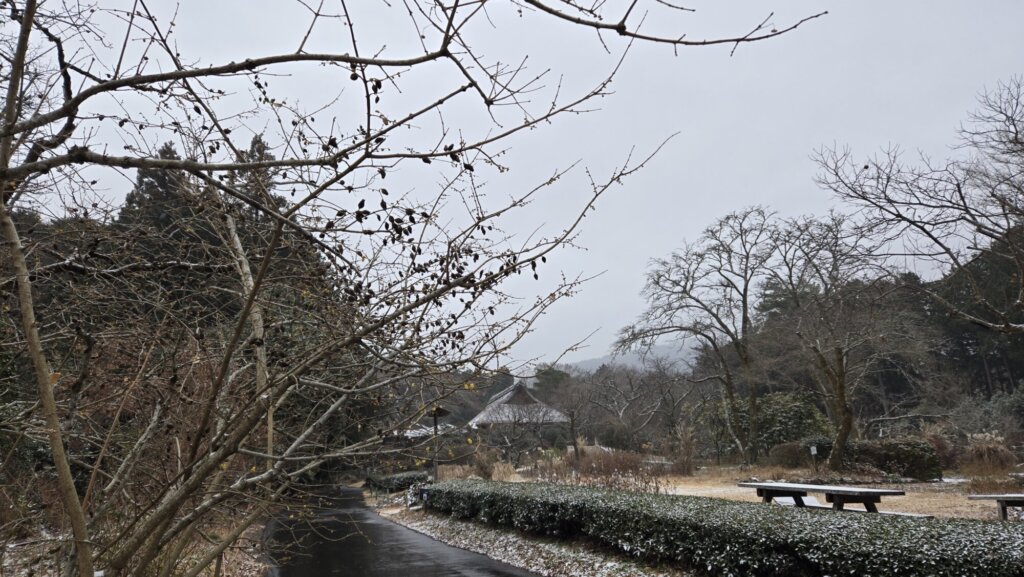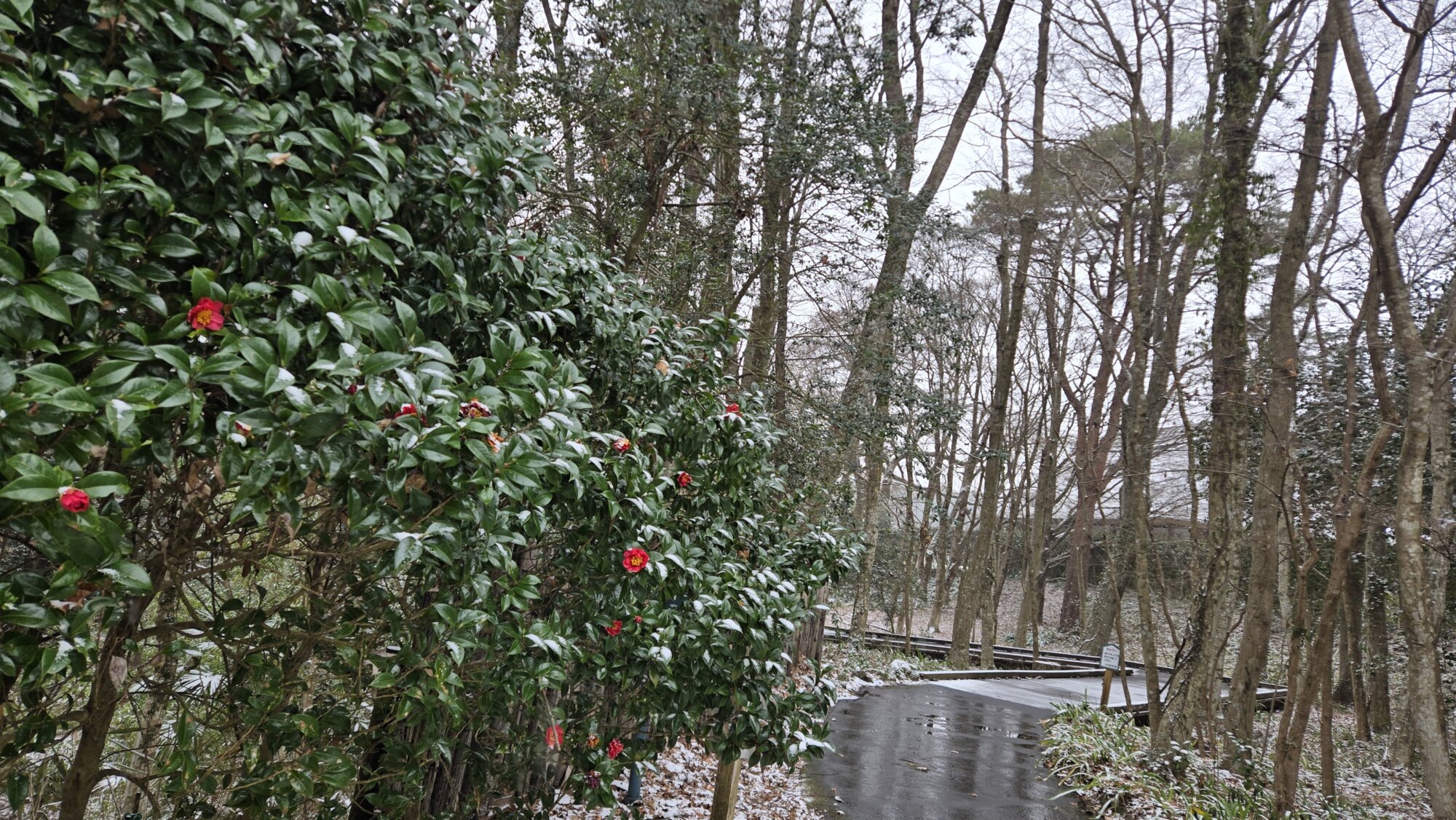 早朝から小雪が舞う園内では、昨日までの温かさのためか三峰窯付近のロウバイや早咲きのウメがぽつりぽつりと開花を始めました。