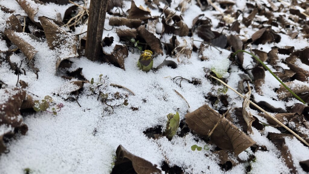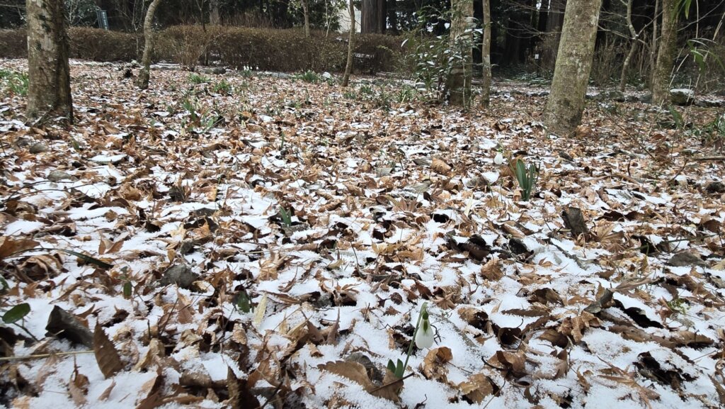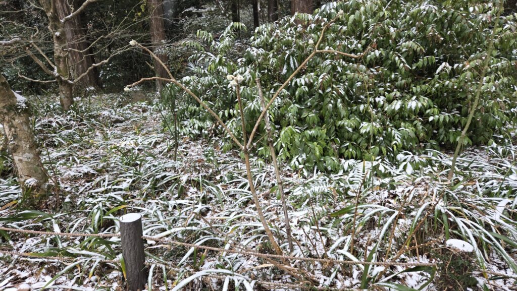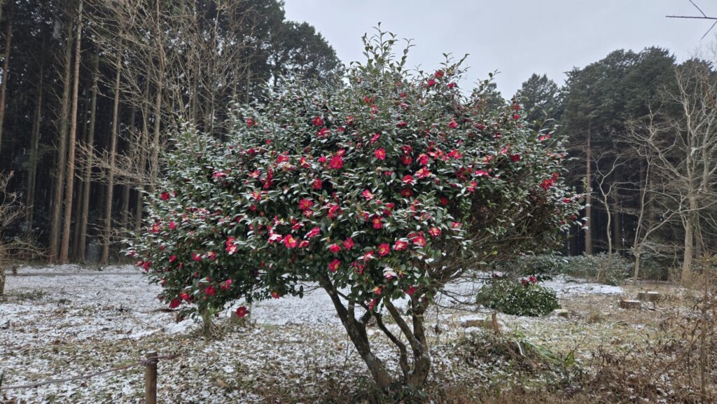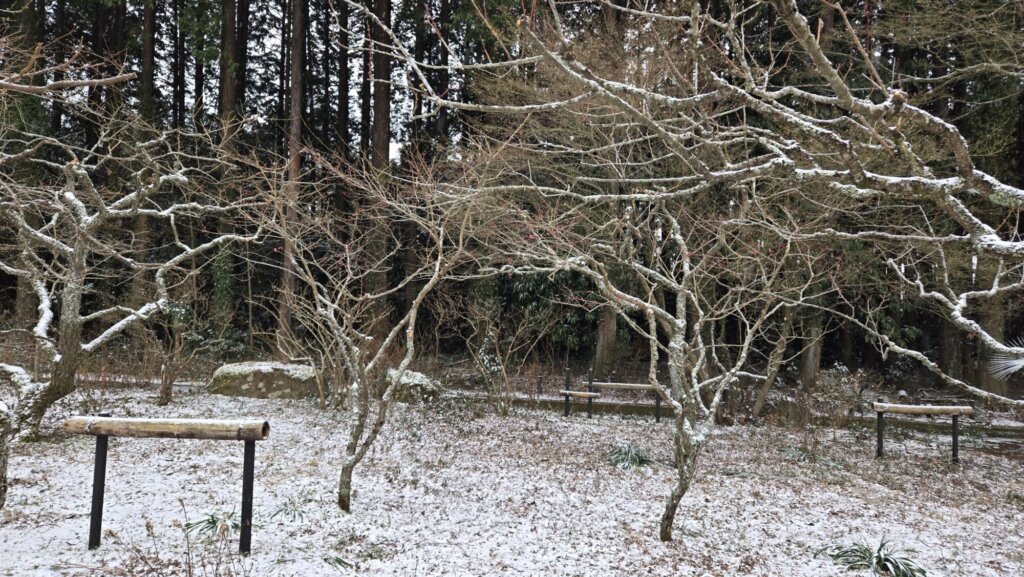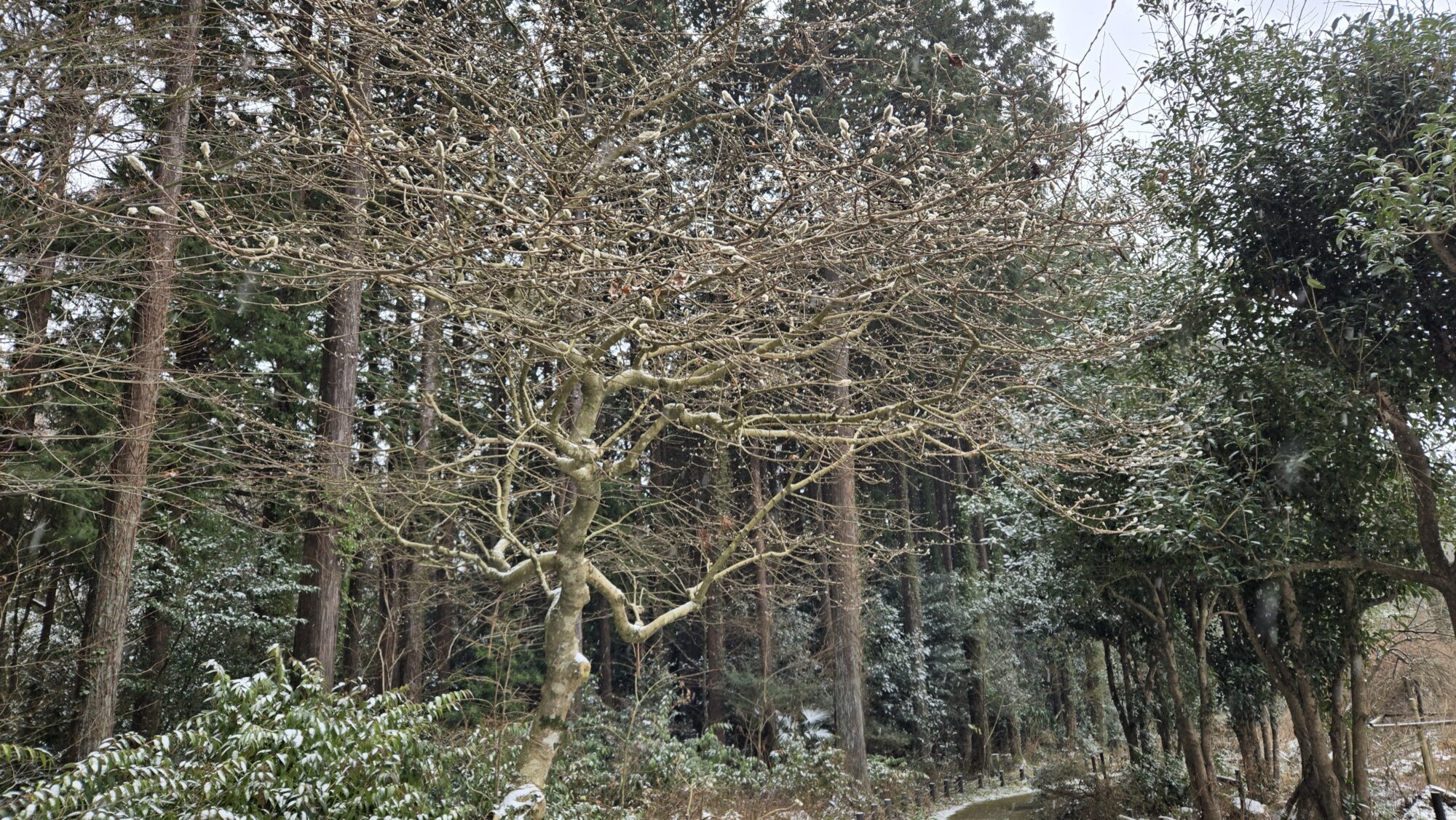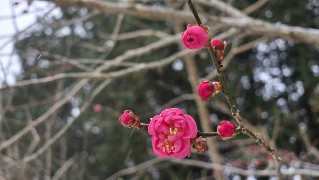 早朝から小雪が舞う園内では、昨日までの温かさのためか三峰窯付近のロウバイや早咲きのウメがぽつりぽつりと開花を始めました。