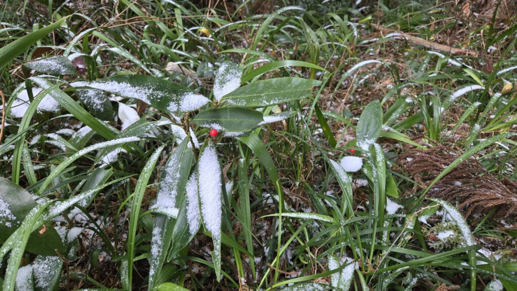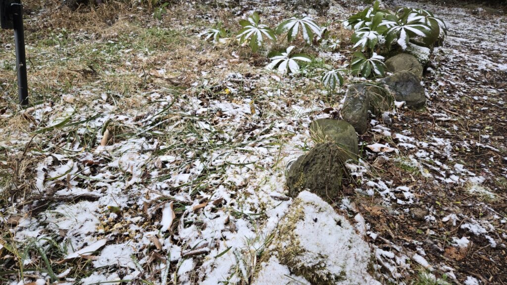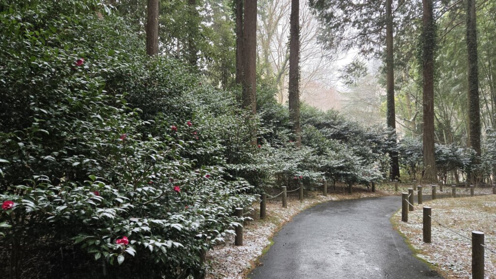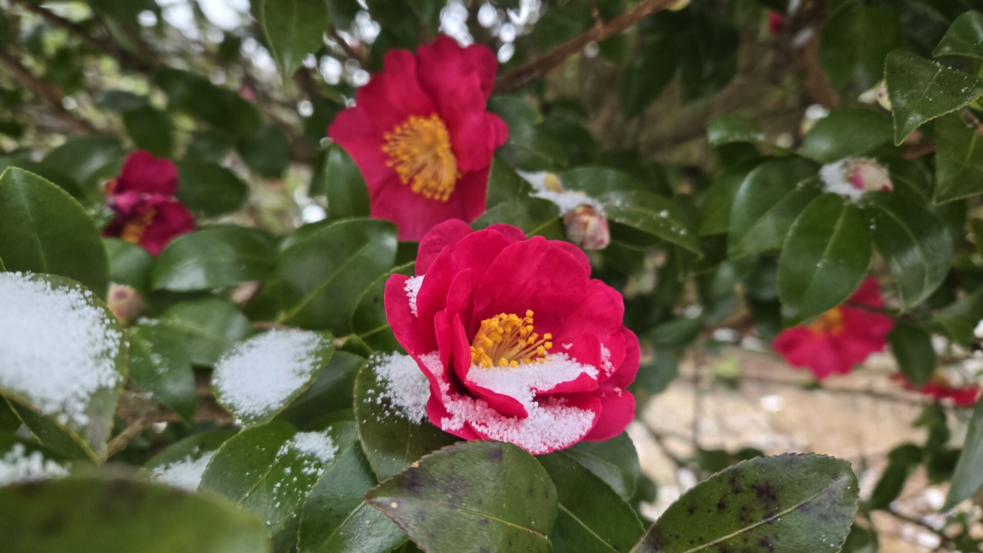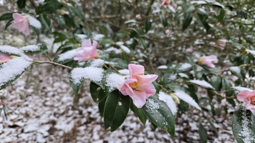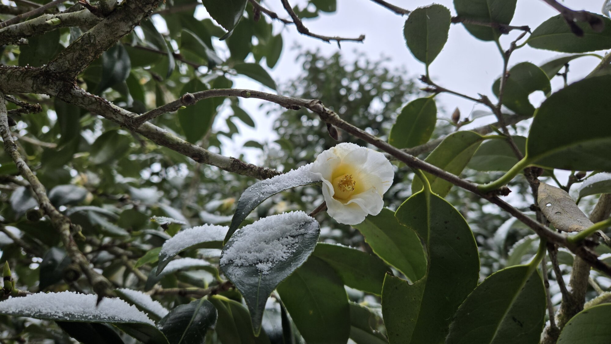 早朝から小雪が舞う園内では、昨日までの温かさのためか三峰窯付近のロウバイや早咲きのウメがぽつりぽつりと開花を始めました。