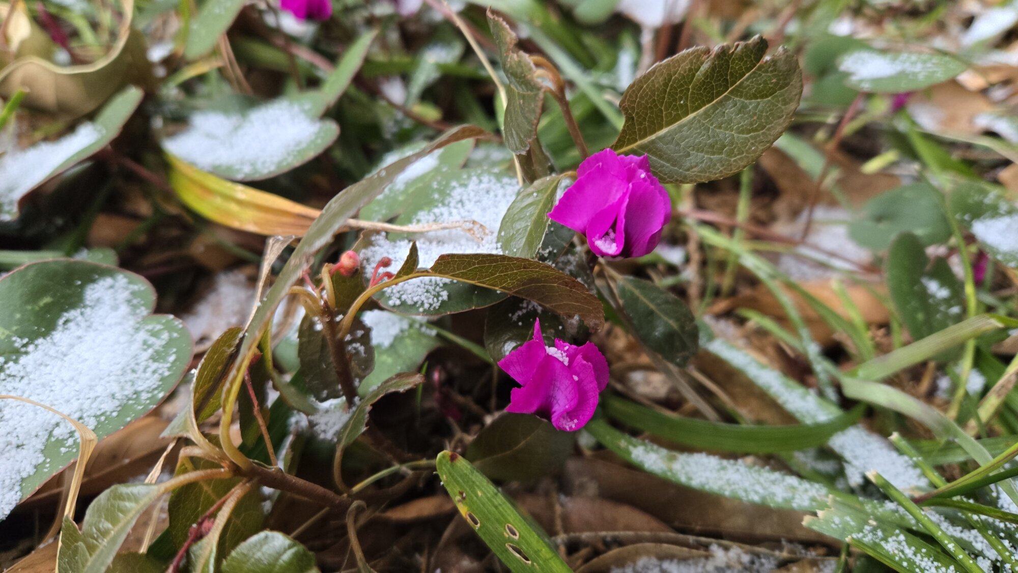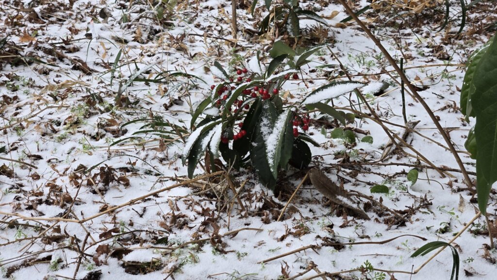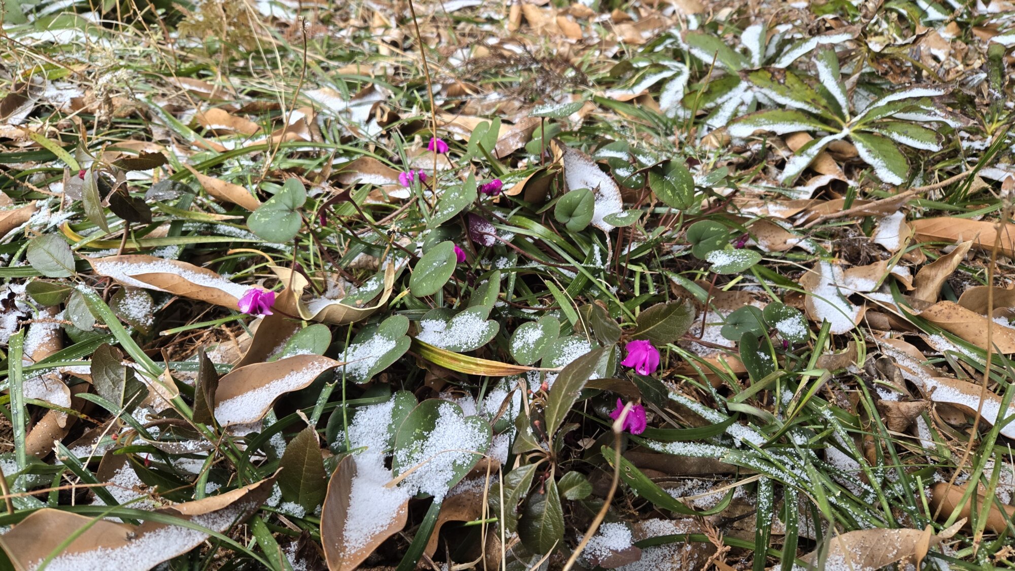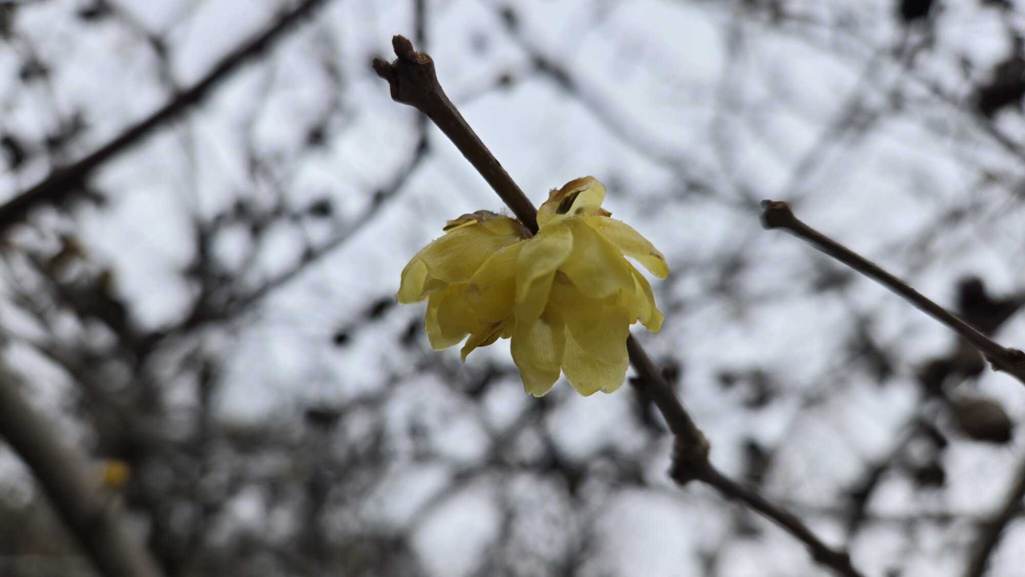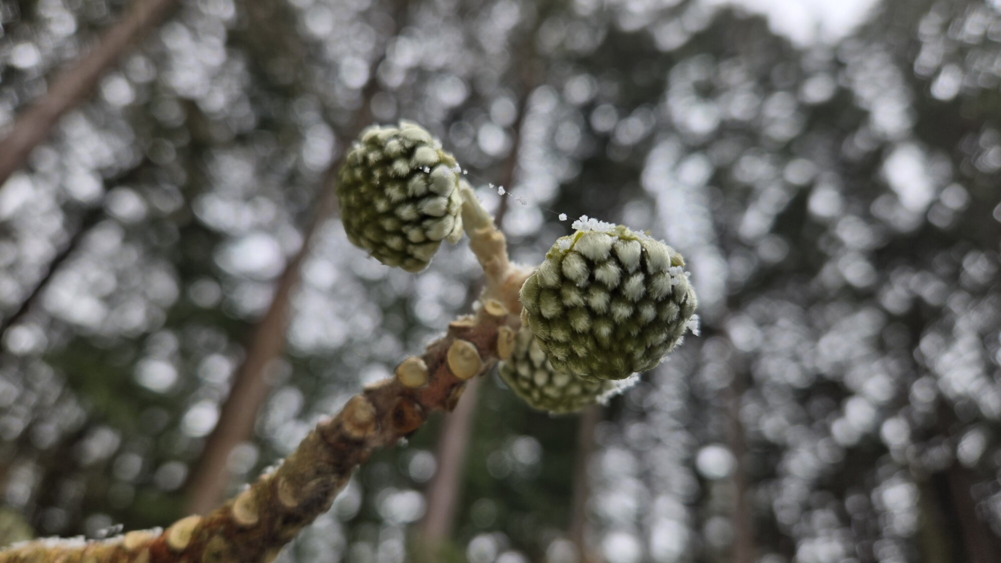 早朝から小雪が舞う園内では、昨日までの温かさのためか三峰窯付近のロウバイや早咲きのウメがぽつりぽつりと開花を始めました。