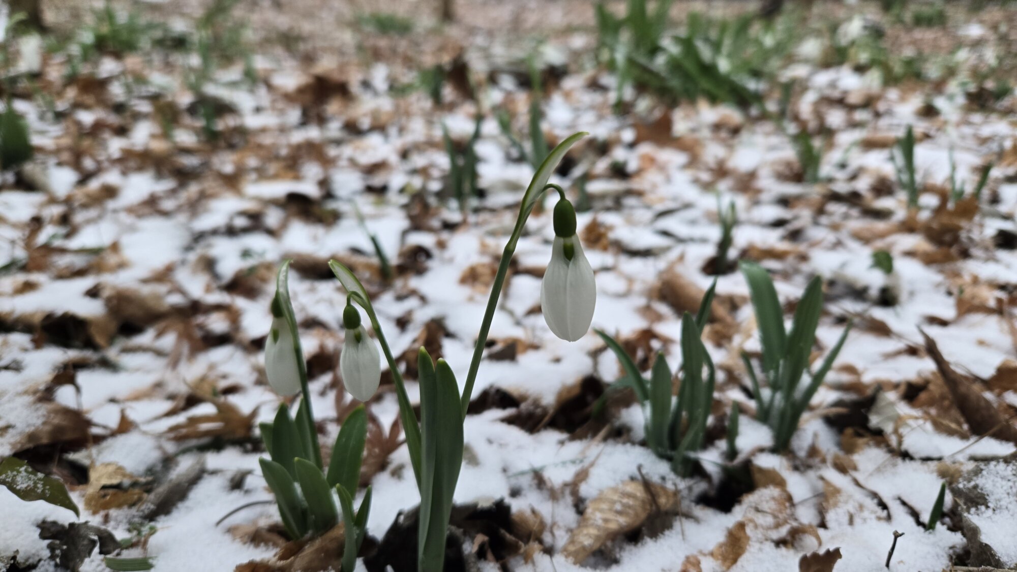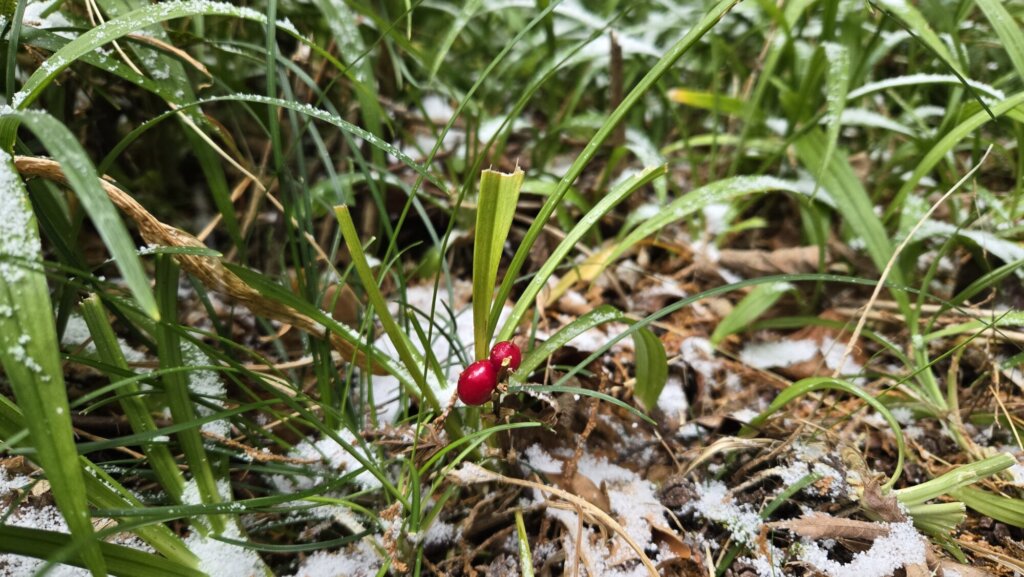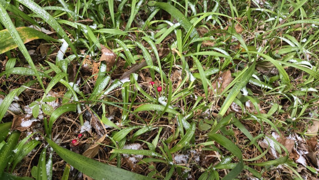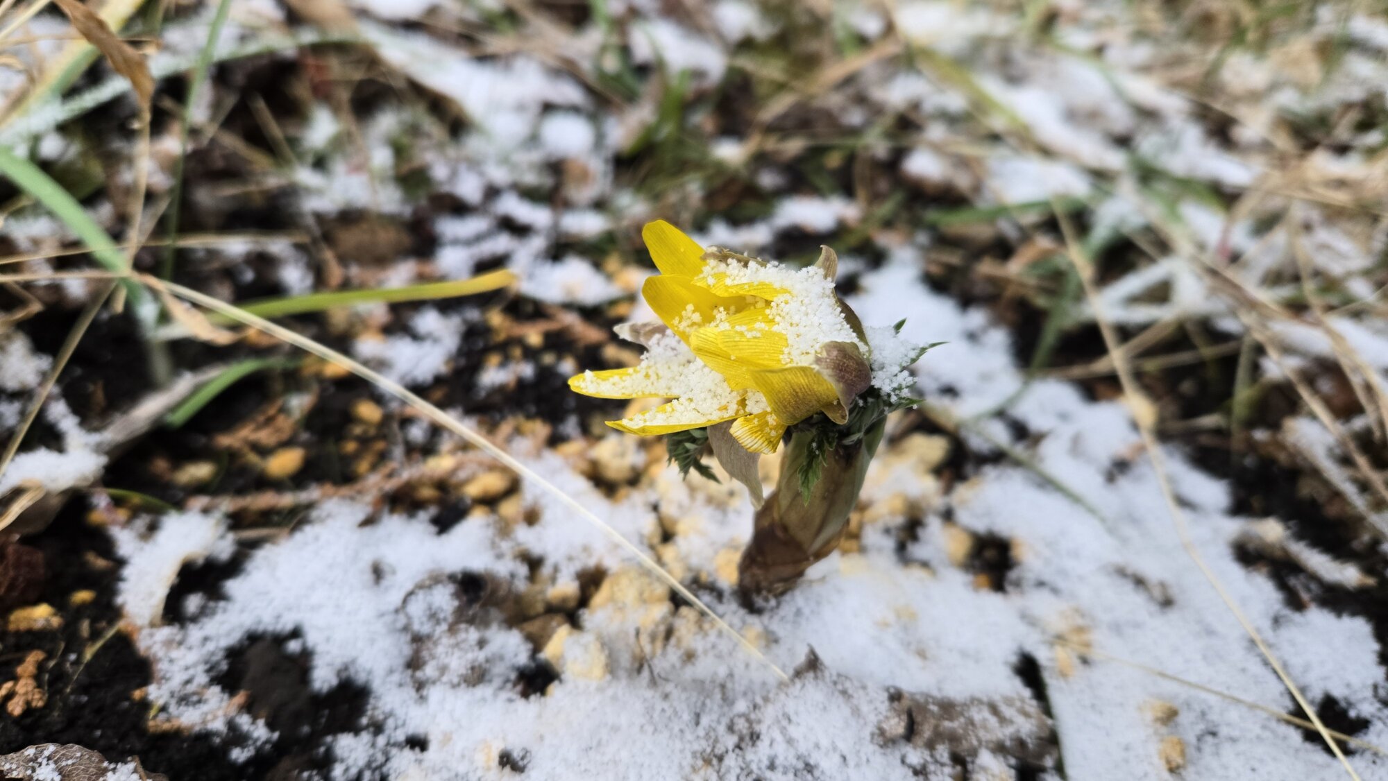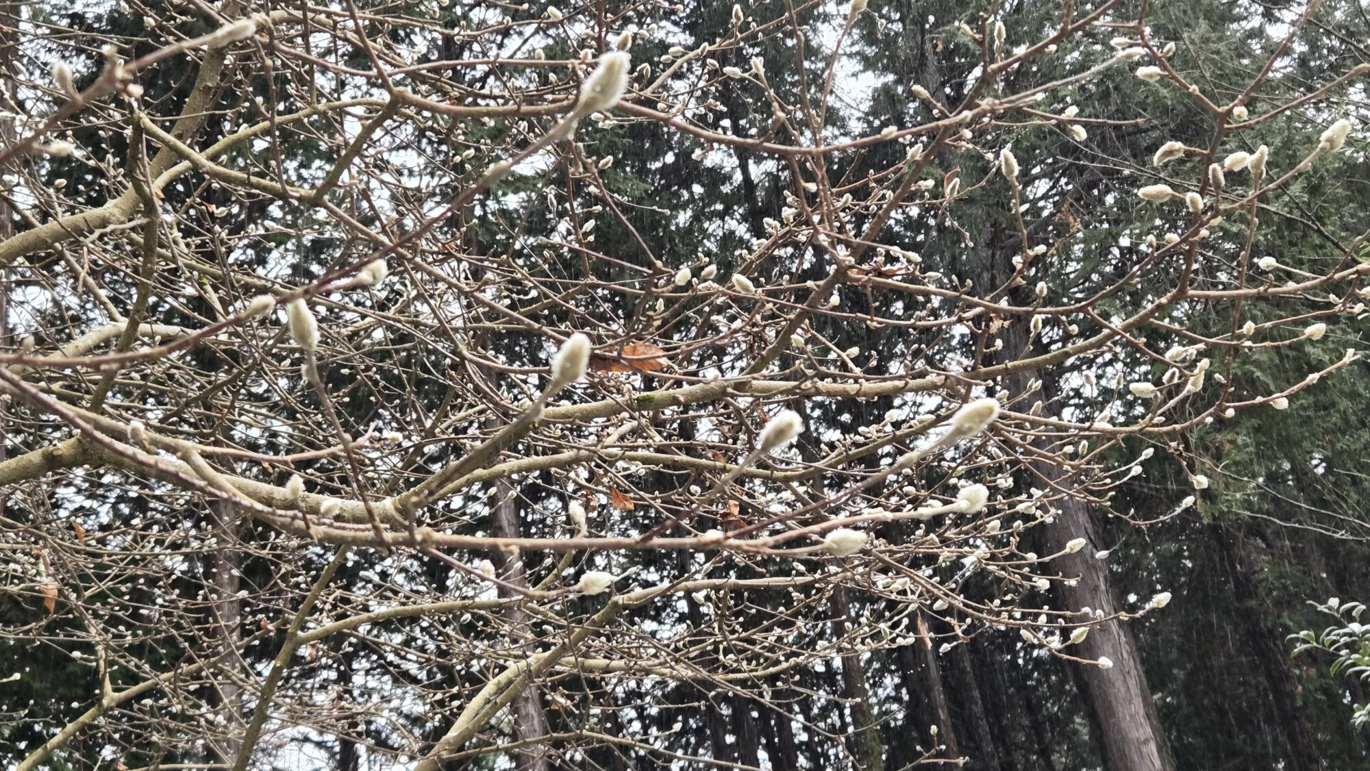 早朝から小雪が舞う園内では、昨日までの温かさのためか三峰窯付近のロウバイや早咲きのウメがぽつりぽつりと開花を始めました。