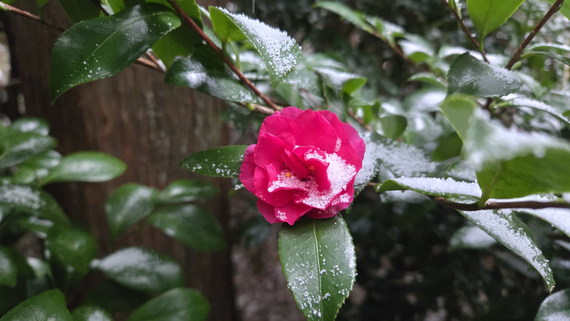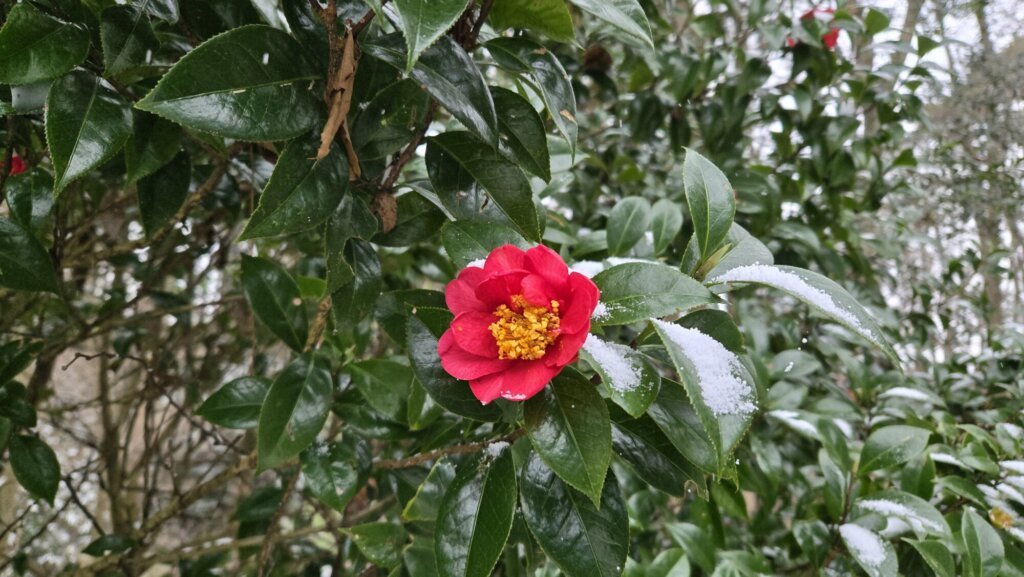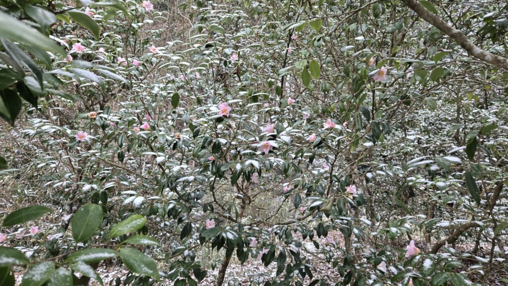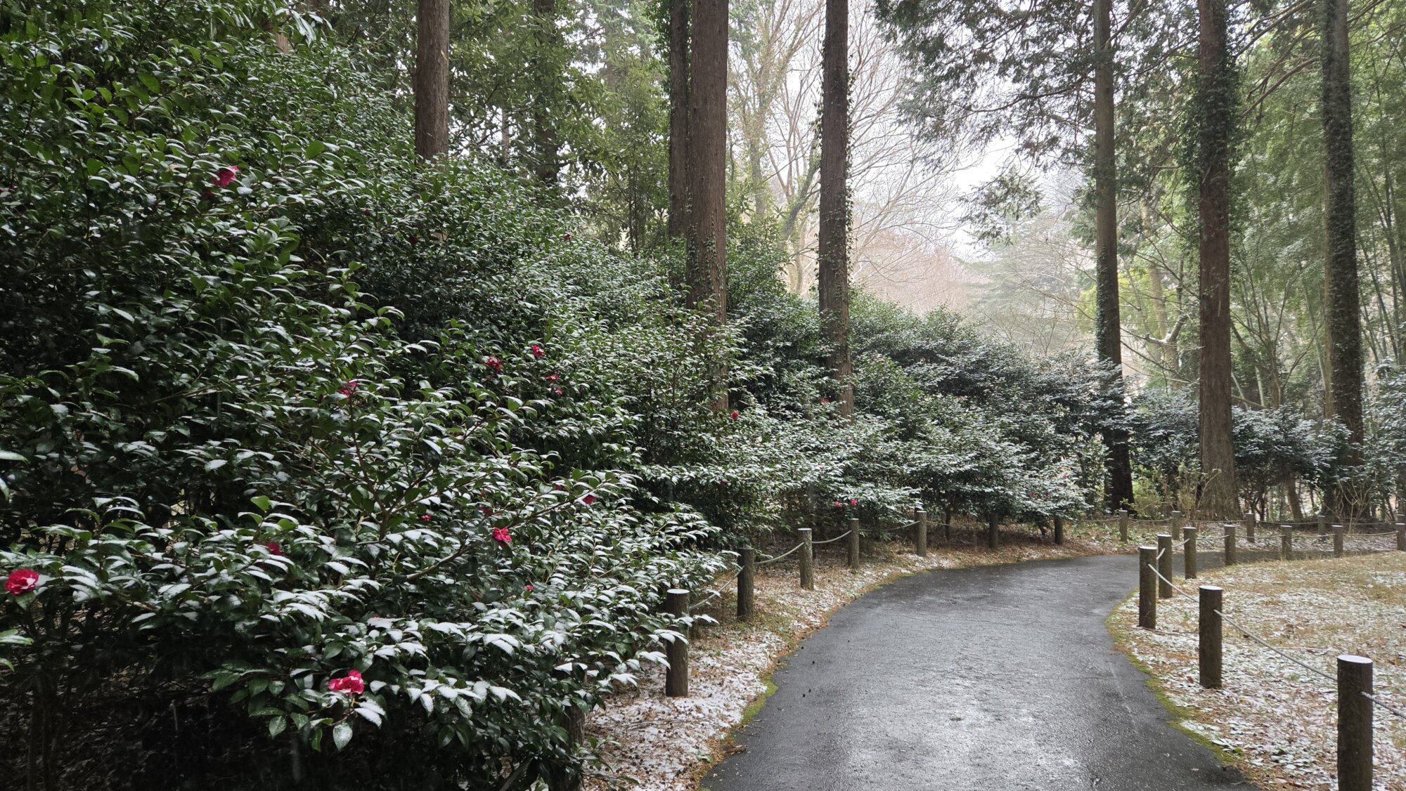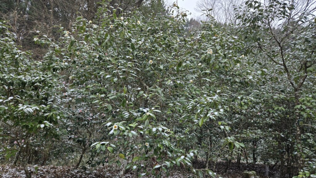 ユキツバキ(三本モミジバフウ・母屋・憩いの庭付近)