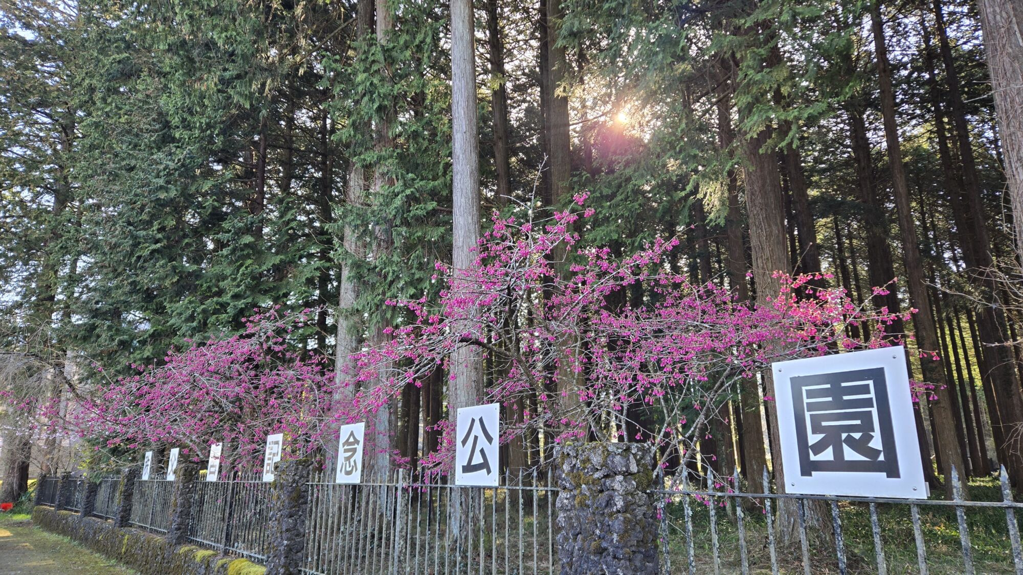 正門付近のカンヒザクラは六分咲き