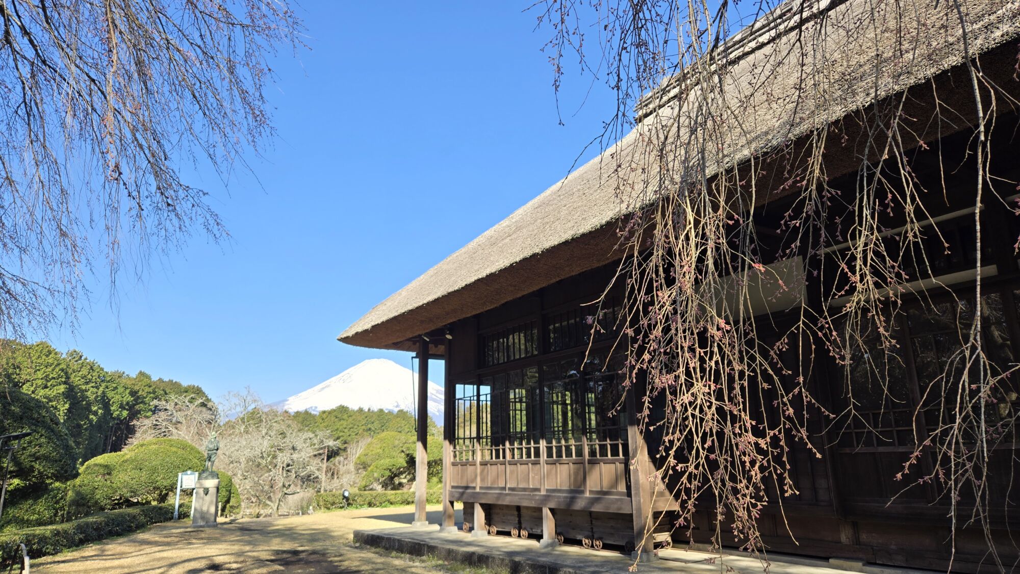 昨日の雨後気温が上がったためか、銅像側のシダレザクラが開花を迎えました。