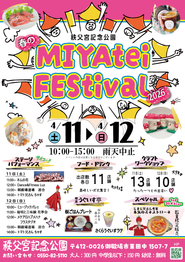 春のMIYAteiFEStival2026 開催! Posted on 2026年3月25日 春のMIYAteiFEStival2026 開催! 詳しい出店者紹介はInstagram( 秩父宮記念公園イベント(@chichibunomiya_event) • Instagram写真と動画)にて 順次更新してまいりますので、 ご確認ください!! 秩父宮記念公園